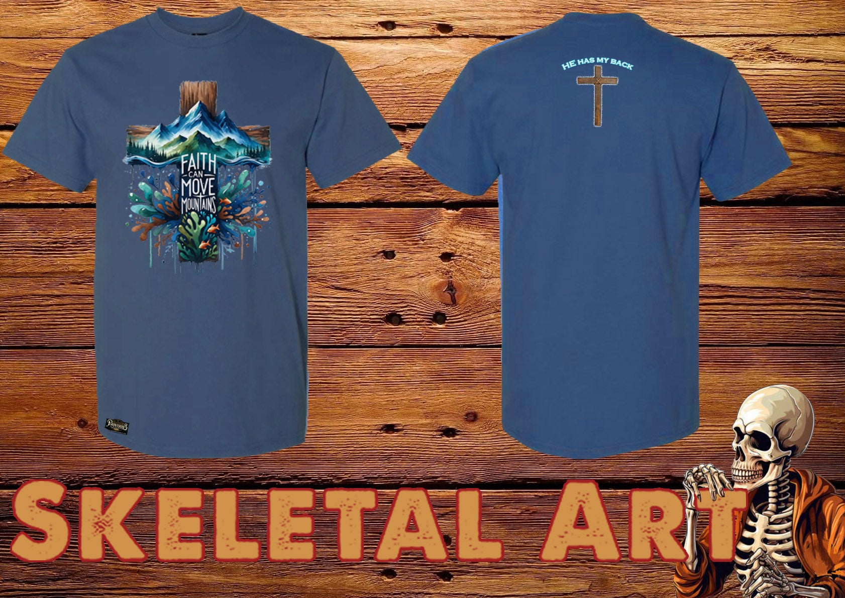 Front Print: A vivid mountain scene wrapped in florals and abstract art, anchored by the empowering message “Faith Can Move Mountains.”