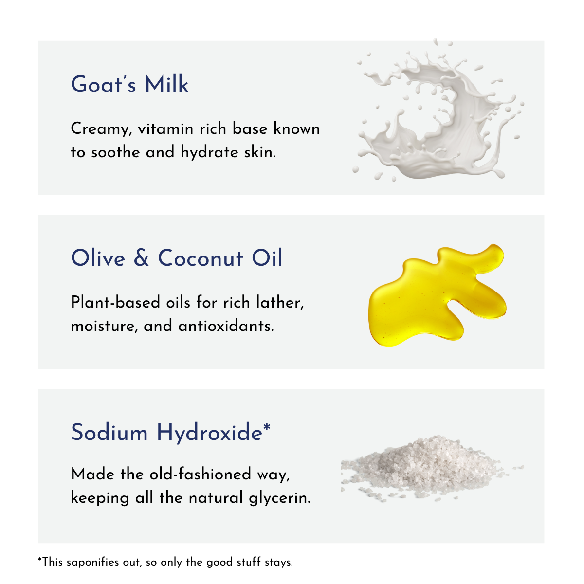 Ingredients: Goats Milk, Saponified Coconut Oil, Saponified Olive Oil (Extra Virgin & Pomace), Peppermint Essential Oil, Eucalyptus Essential Oil, French Green Clay.