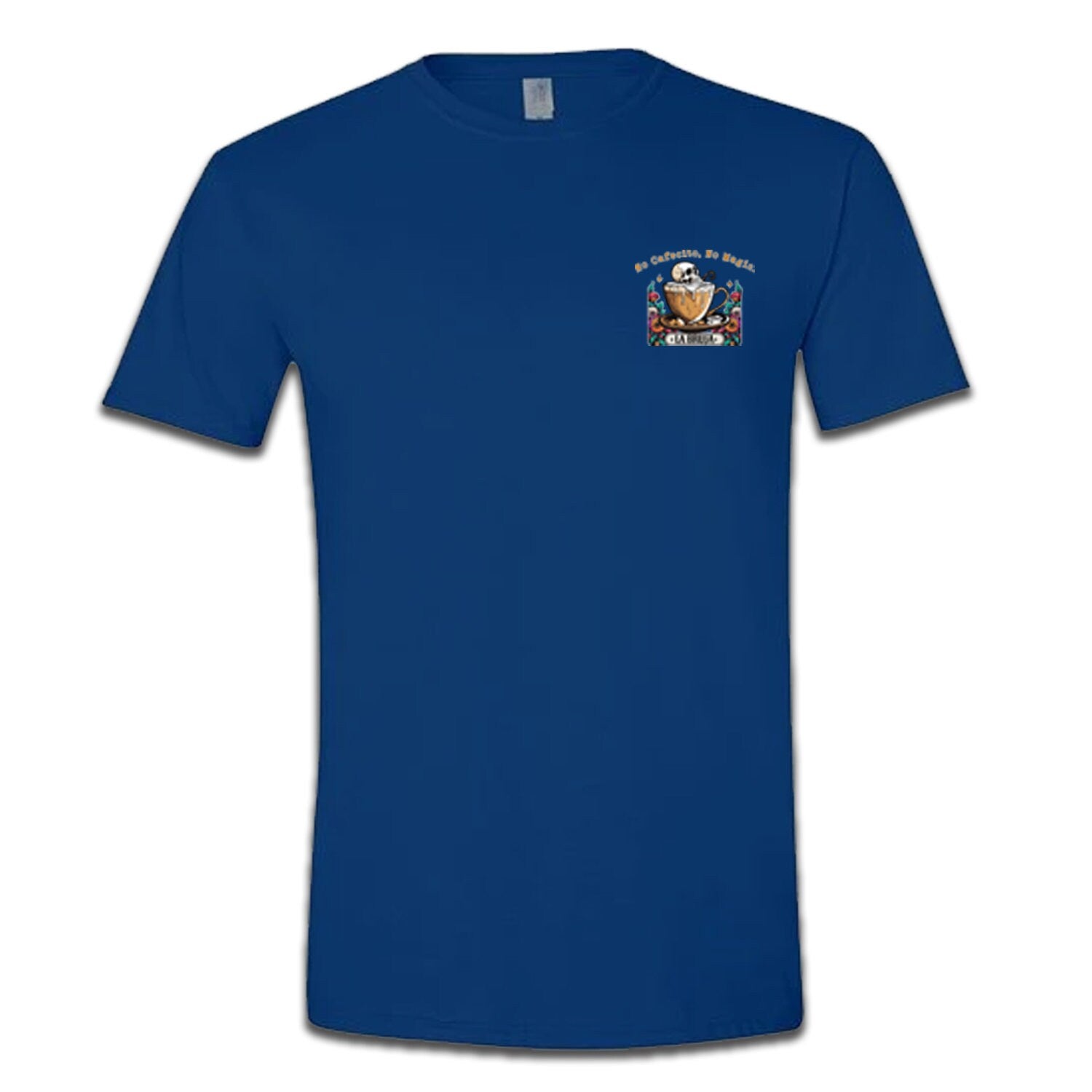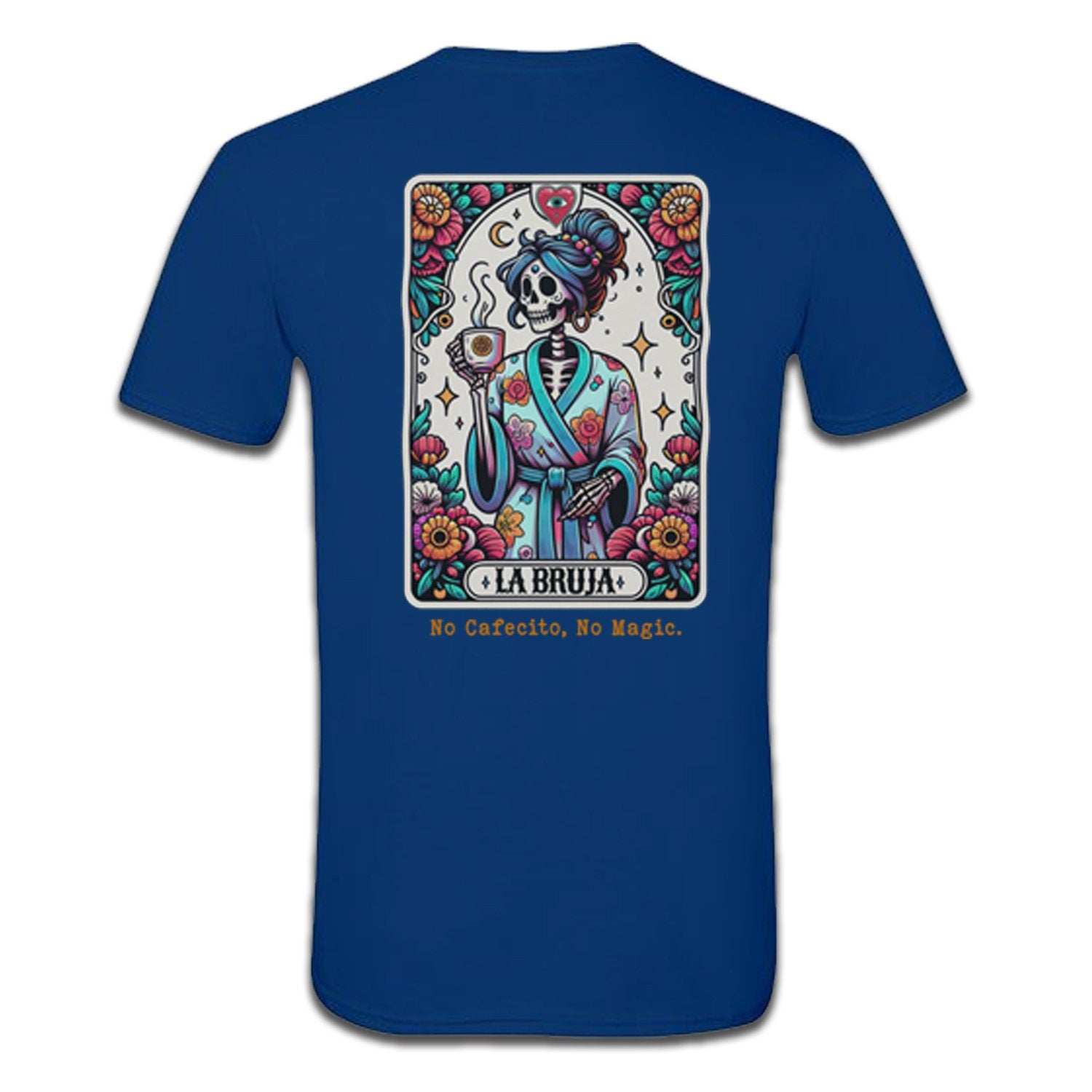 The back of the t-shirt showcases an elaborate and colorful depiction of "La Bruja," a skeletal figure dressed in traditional attire surrounded by flowers and mystical symbols. The text "La Bruja" is prominently displayed below the artwork, enhancing its unique charm and making it a true statement piece.